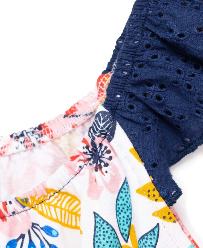 Combishort imprimé pour filleCombishort 100% coton sans manches avec apport de dentelle marineImprimé floral en all-overCeinture élastiquée avec noeudTellement fille et tellement légère, la combishort est le must have de l’été ! Tendance et confortable à la fois !