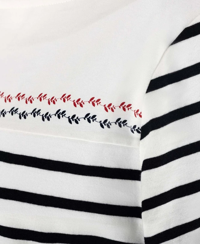 100 % COTON-fond blanc rayé marine-Empiècement blanc et motif marine et rouge sur le devant.-Bas des manches en bord côte fantaisie avec apport de rouge